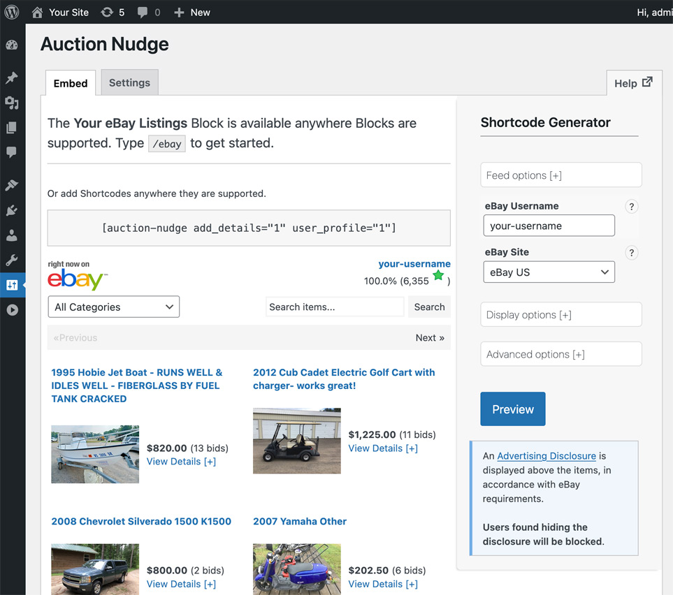 Now you can add the “Your eBay Listings” Block to your page and customize using the Block options. Shortcodes are also supported and can be customized using the Shortcode Generator (Settings > Auction Nudge).