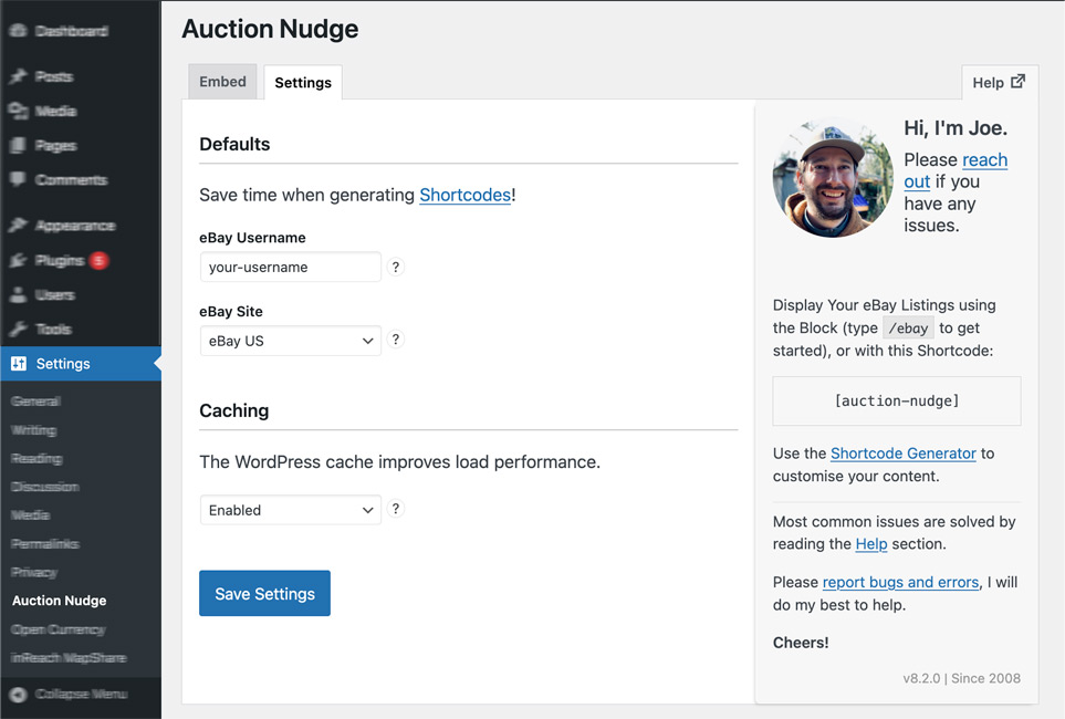 Once the plugin has been activated, go to Settings > Auction Nudge to set your default eBay username and eBay site. These aren’t required, but this will save you time.