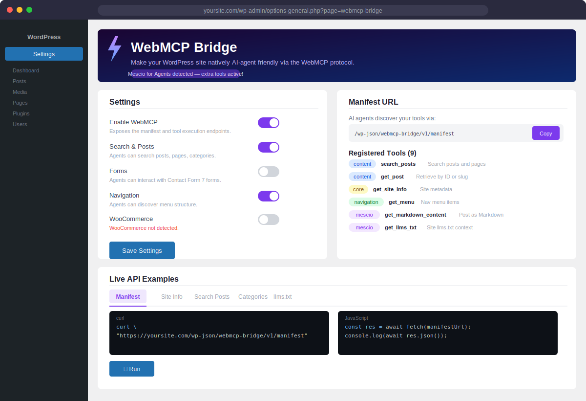 Together, the two plugins turn your WordPress site into a fully AI-native content source: WebMCP Bridge handles the tool layer (what agents can do), while Mescio for Agents handles the content layer (what agents can read and understand).